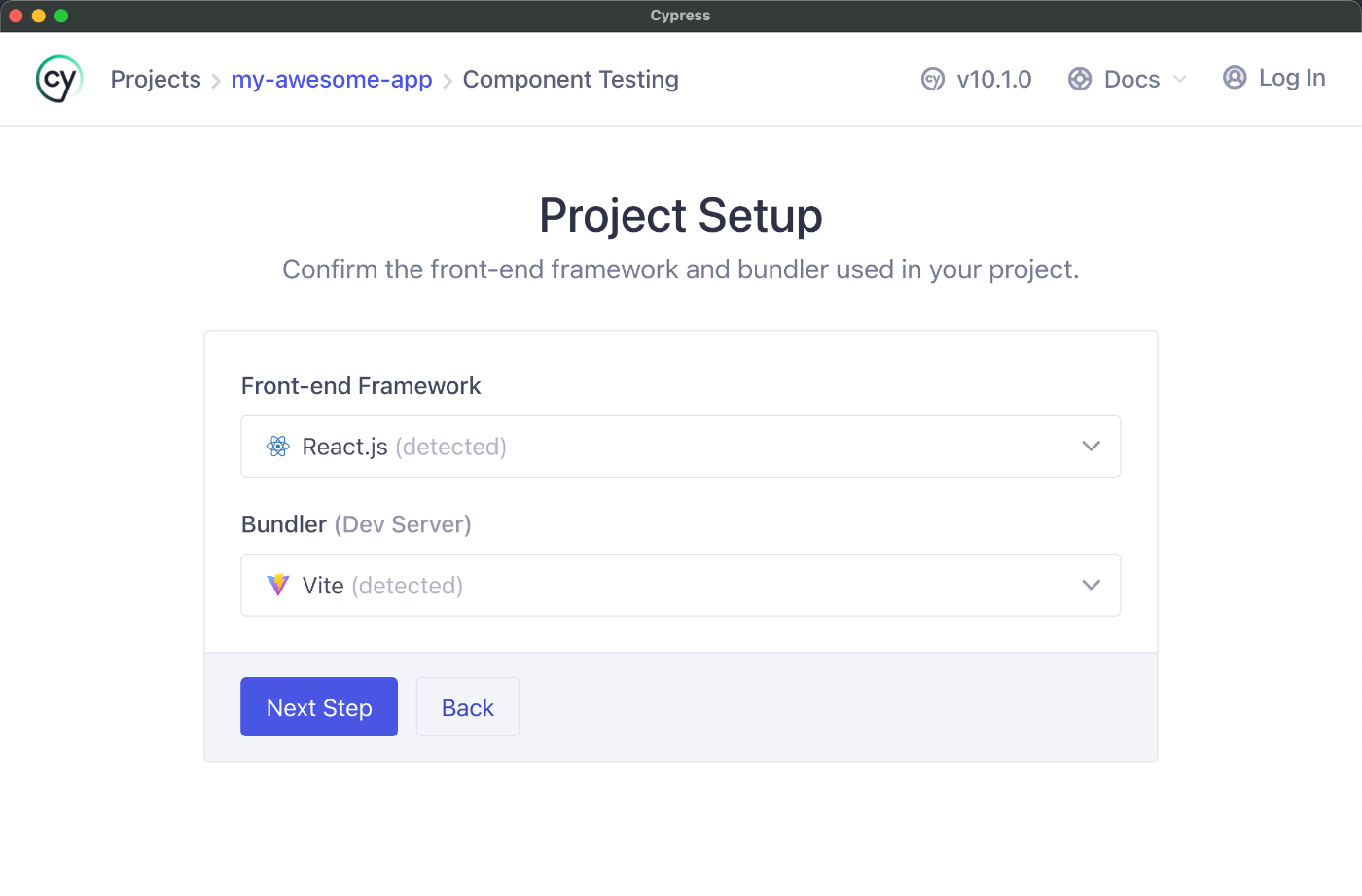 The Project Setup screen automatically detects your framework and bundler, which is React and Vite in our case. Cypress Component Testing uses your existing development server config to render components, helping ensure your components act and display in testing the same as they do in production.